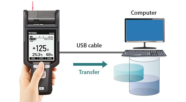 Up to 100 pieces of measured data can be recorded in the sensor’s internal buffer memory. Recorded data can be transferred via a USB cable to a PC where it can be saved as CSV data.