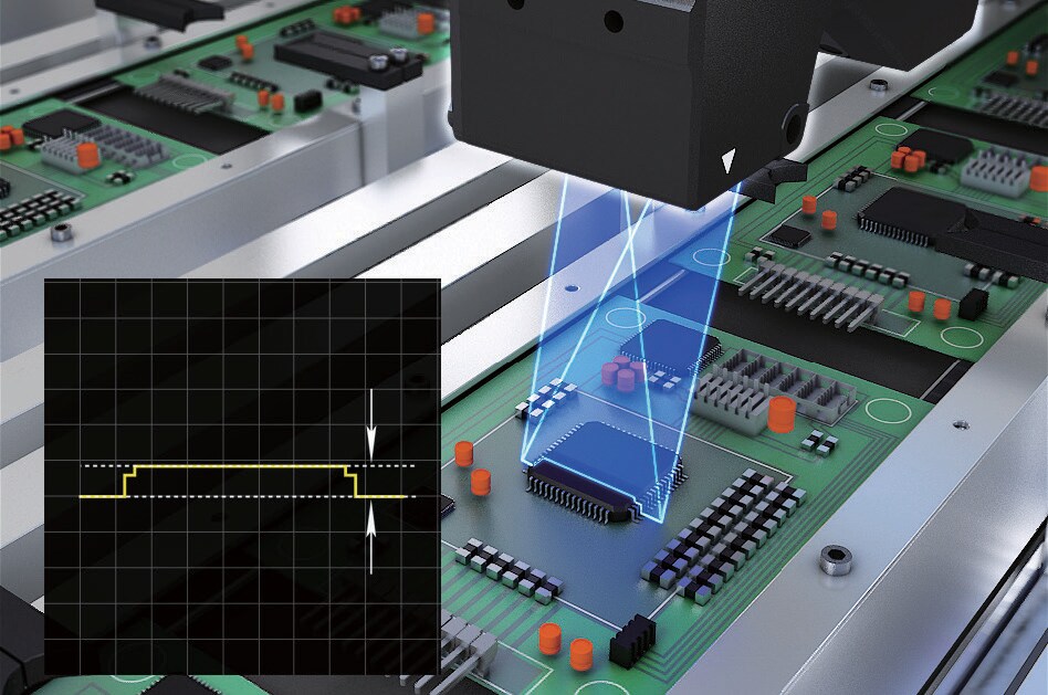 This system can be used to measure the height of integrated chips. Equipped with an alignment adjustment function, it automatically corrects for workpiece tilting and misalignment on a conveyor, enabling more accurate measurement.