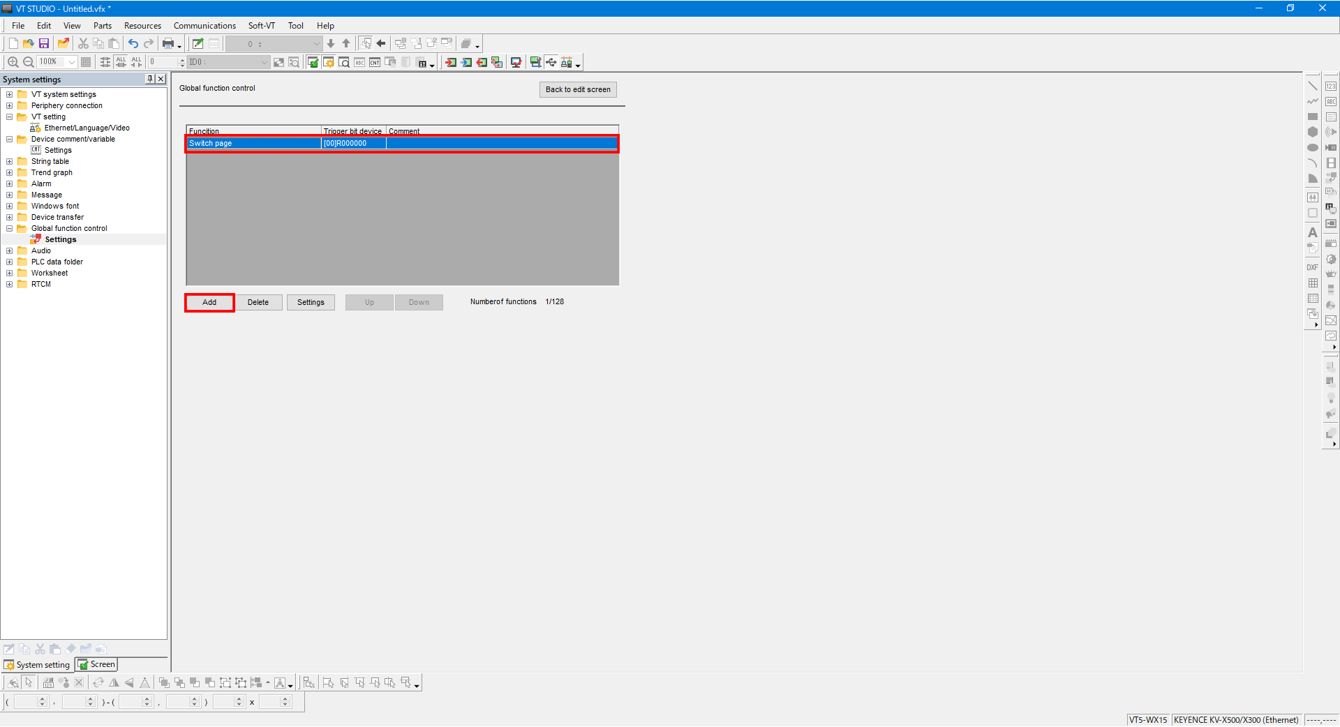 Select the “Set Page No.” check box. In the device displayed to the right of this check box, store the page number of the desired screen to switch to that screen.
