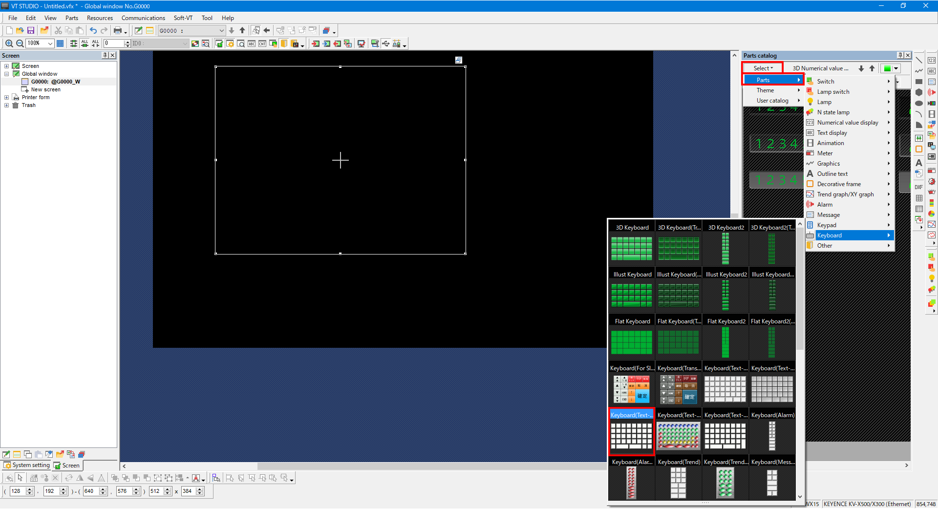 3. In the part catalog, select [Select] -> [Parts] -> [Keyboard], and then select the type of keyboard you want to use.