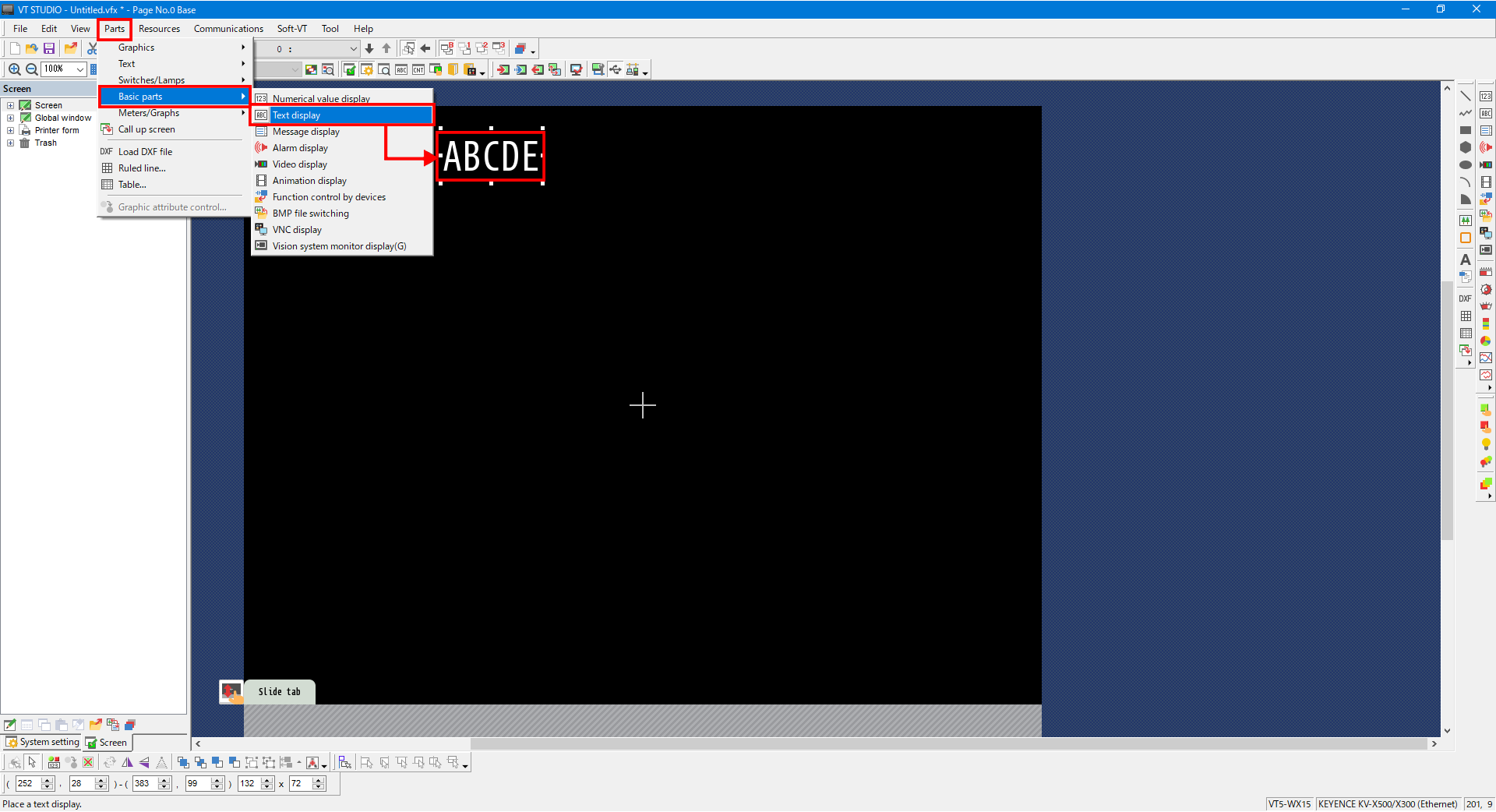 From the menu, select [Parts] -> [Basic parts] -> [Text display], and then place a text display part on the base screen.