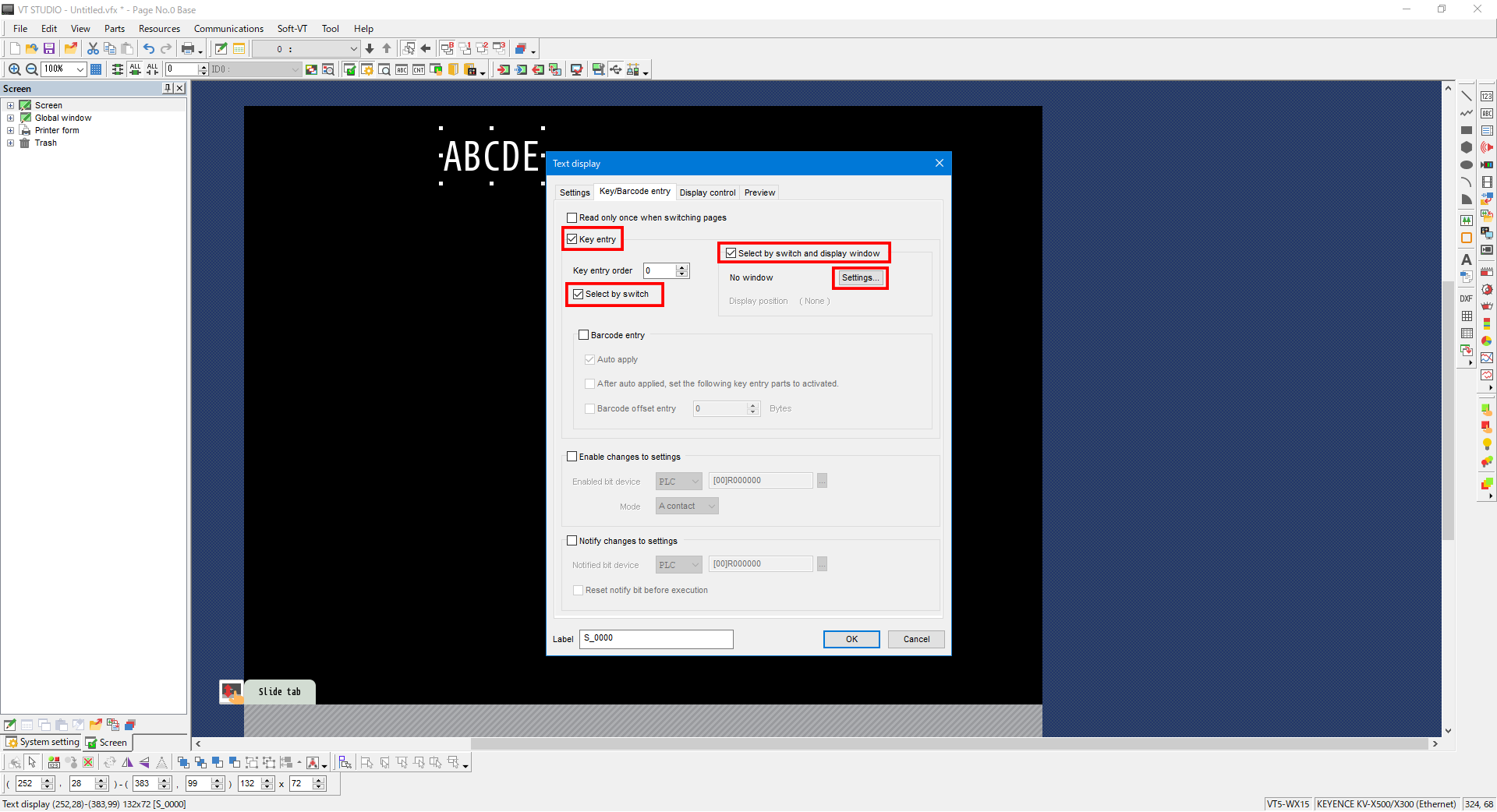6. Open the text display part settings, configure the settings on the “Key/Barcode entry” tab as follows, and then click [Settings].
