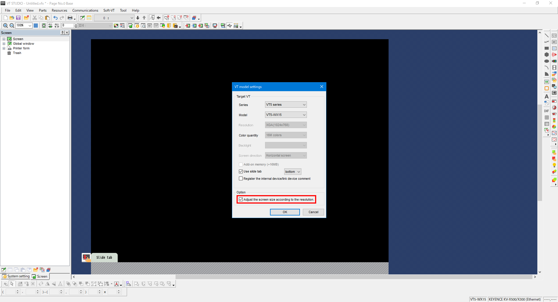 2. Select the model to change to. When changing to a model with a different resolution, select the “Adjust the screen size according to the resolution” check box.