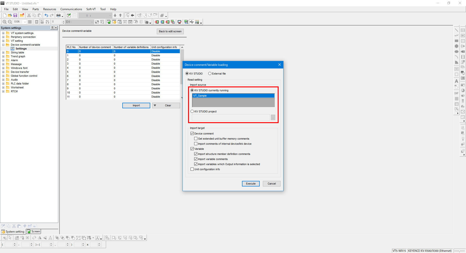 3. Select the KV STUDIO project from which to import the device comments, and then click [Execute].