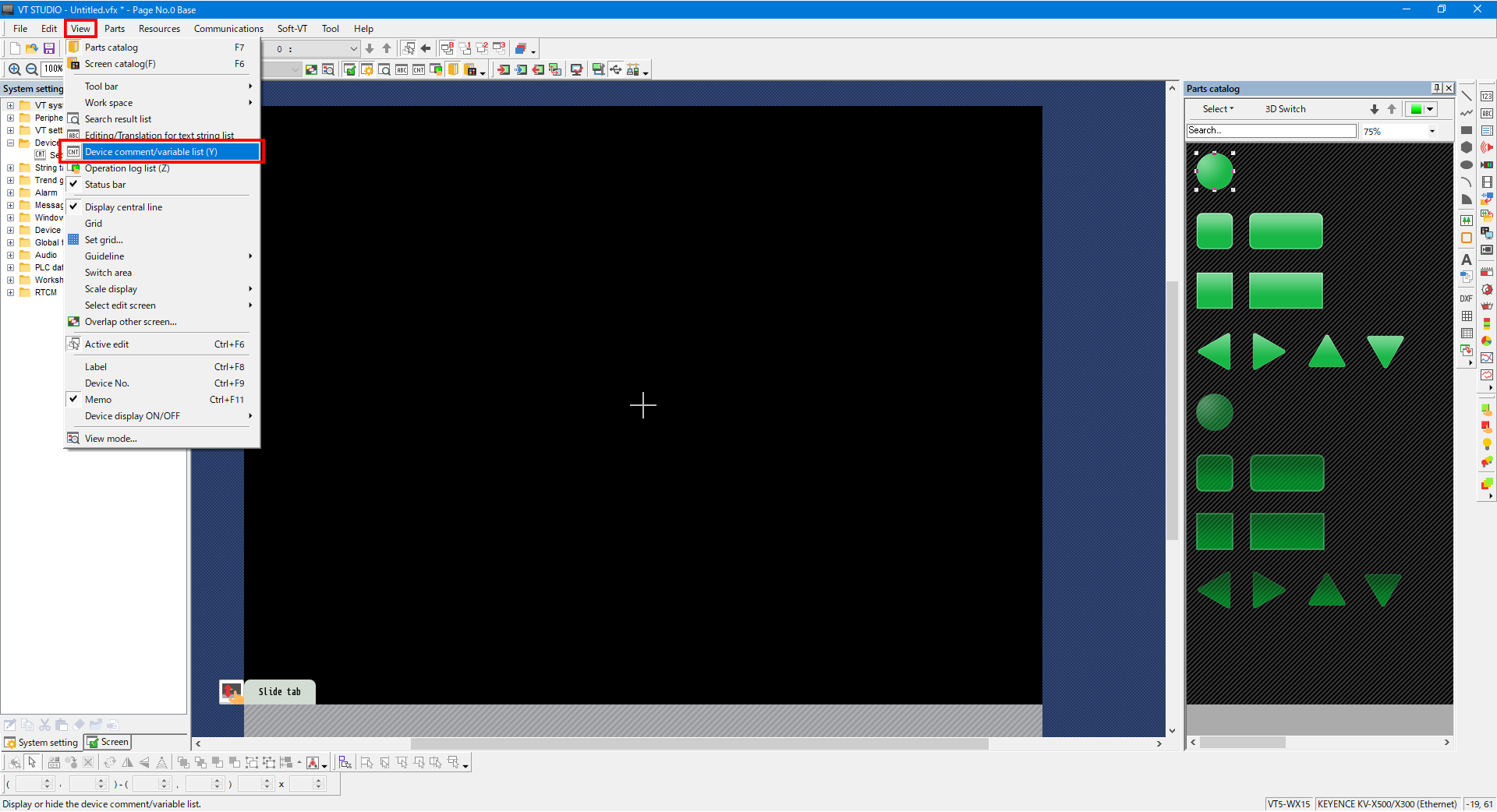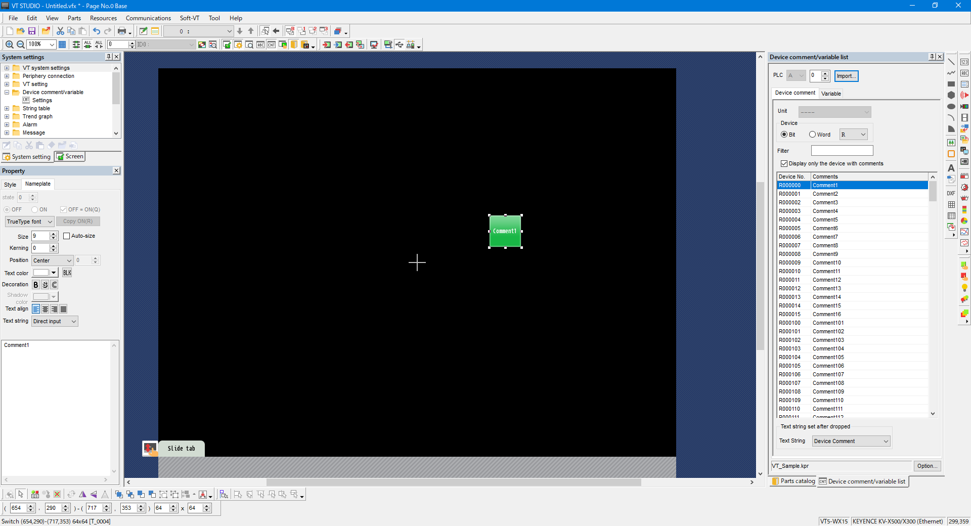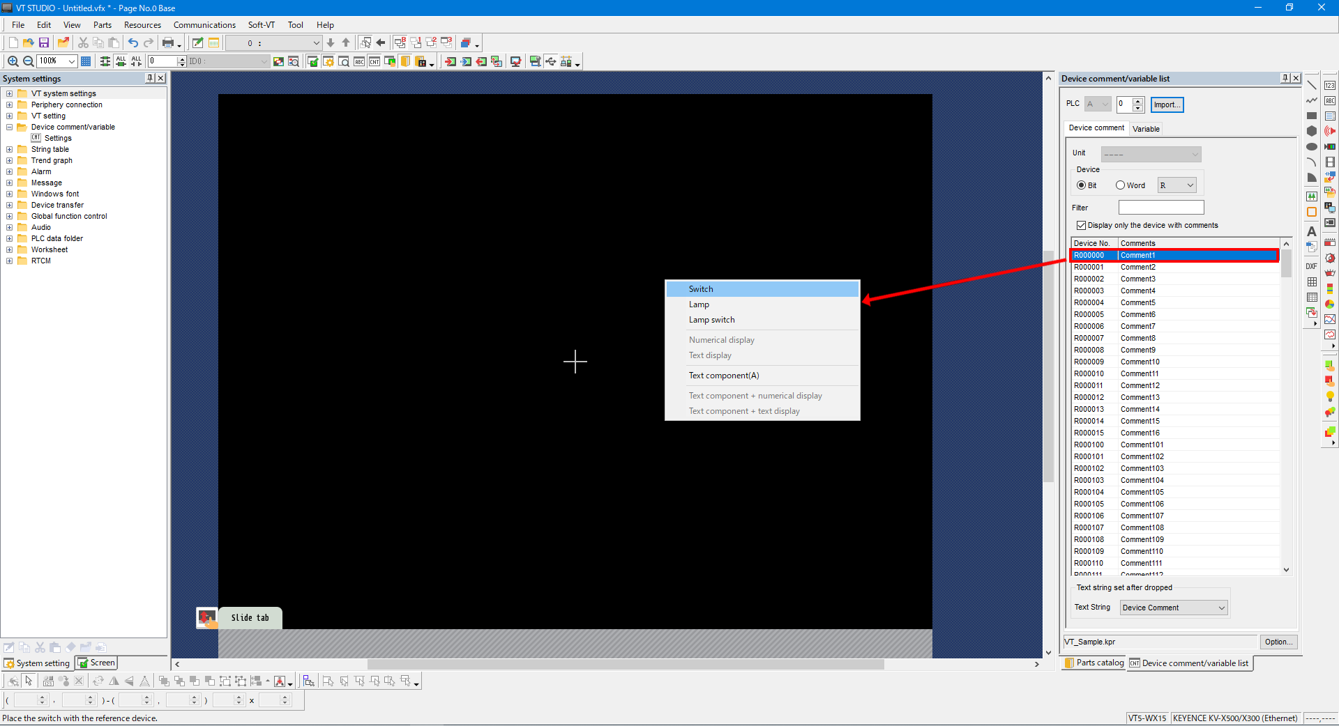6. The [Device comment/variable list] dialog box is displayed on the VT STUDIO screen. Select a device comment and drag and drop it to the screen to place it there.