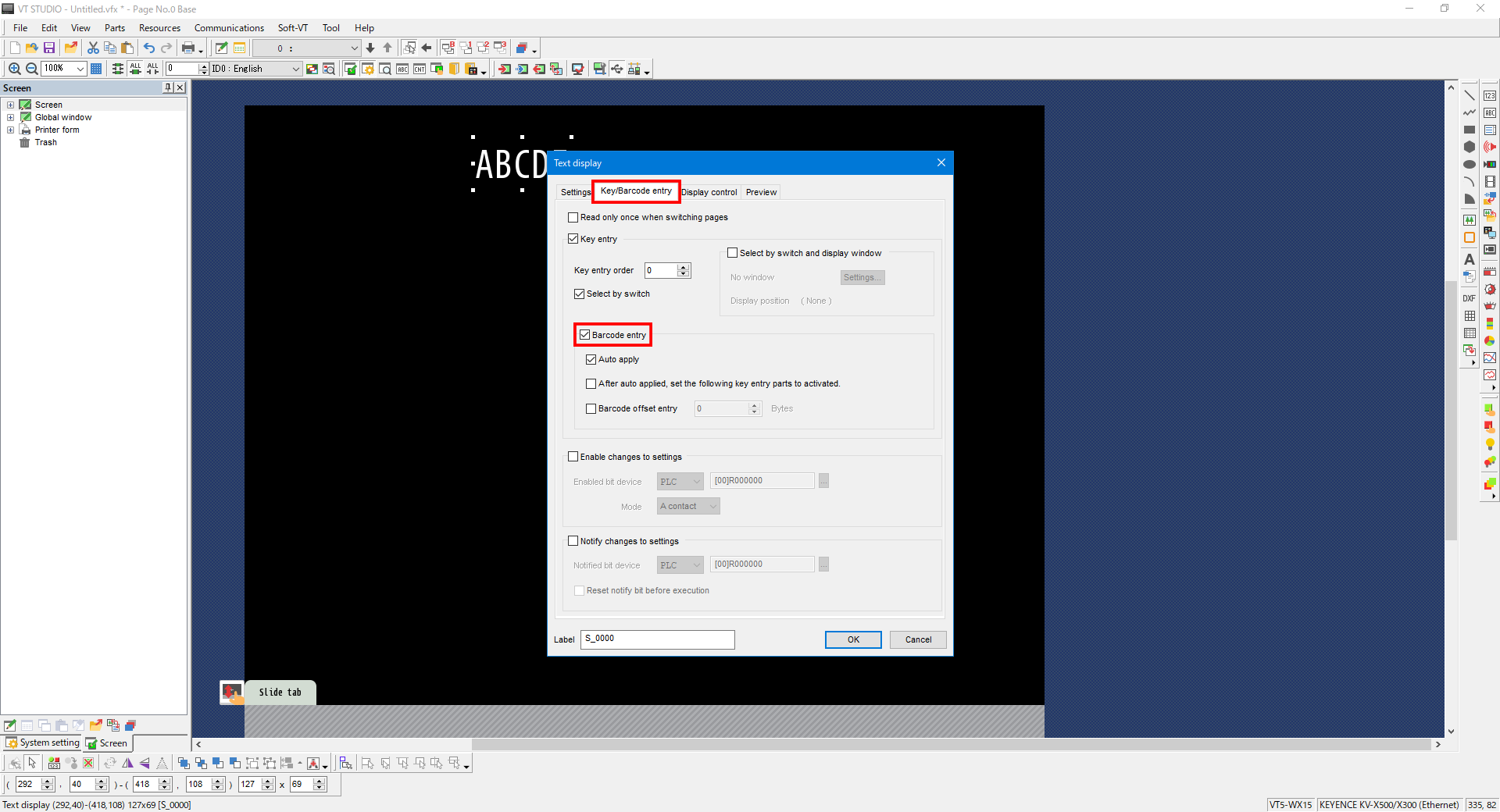 4. Open the text display part settings screen, and then open the “Key/Barcode entry” tab. Select the “Barcode entry” check box.