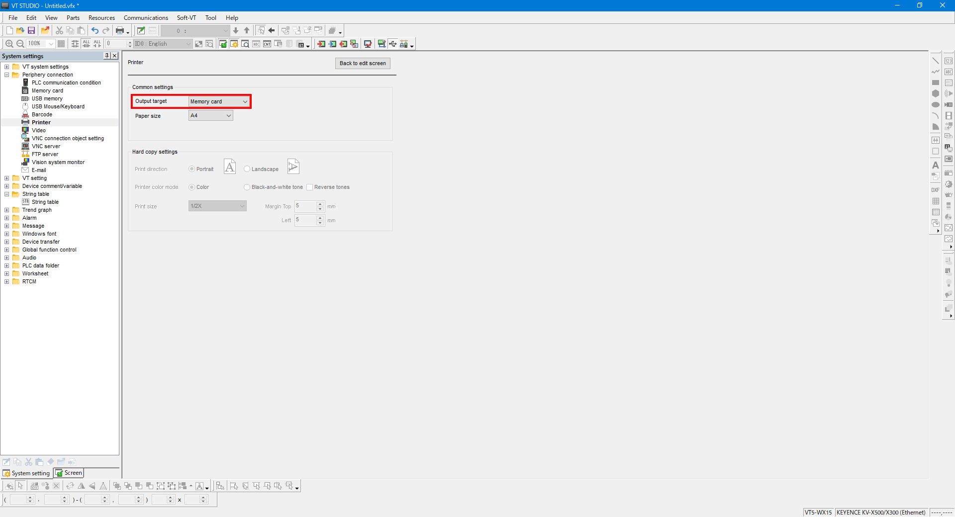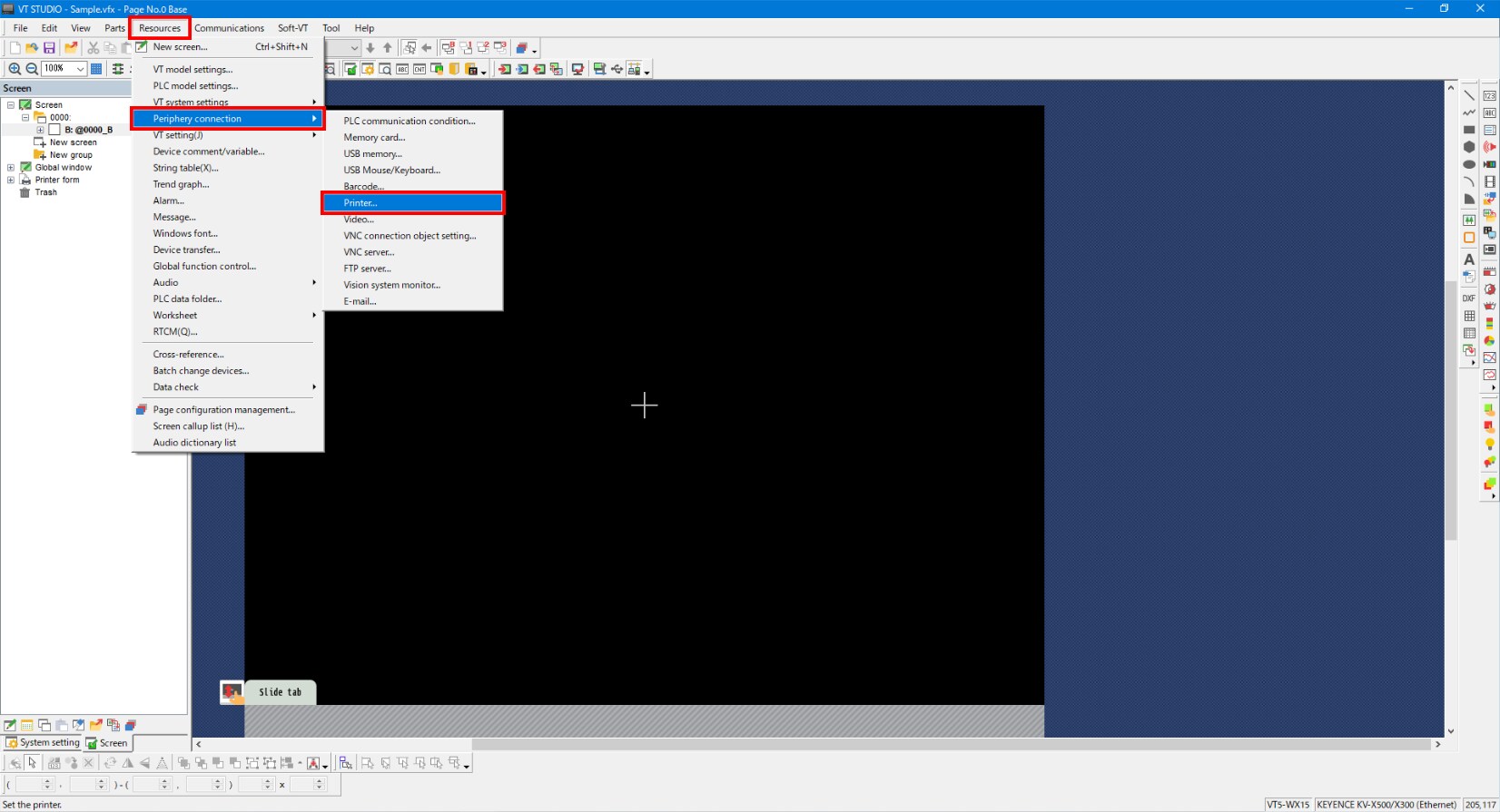 From the menu, select [Resources] -> [Periphery connection] -> [Printer].