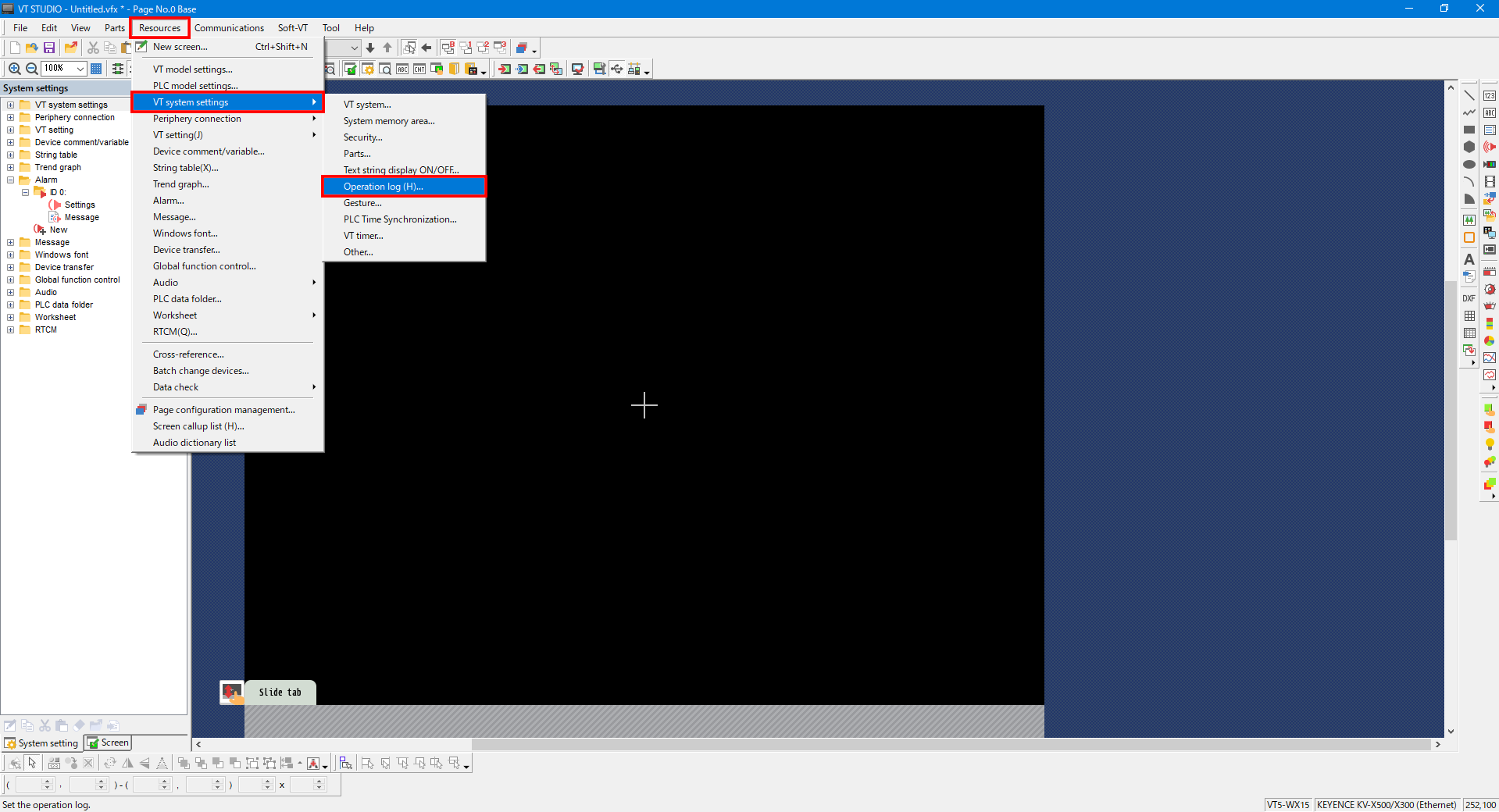 1. From the menu, select [Resources] -> [VT system settings] -> [Operation log].