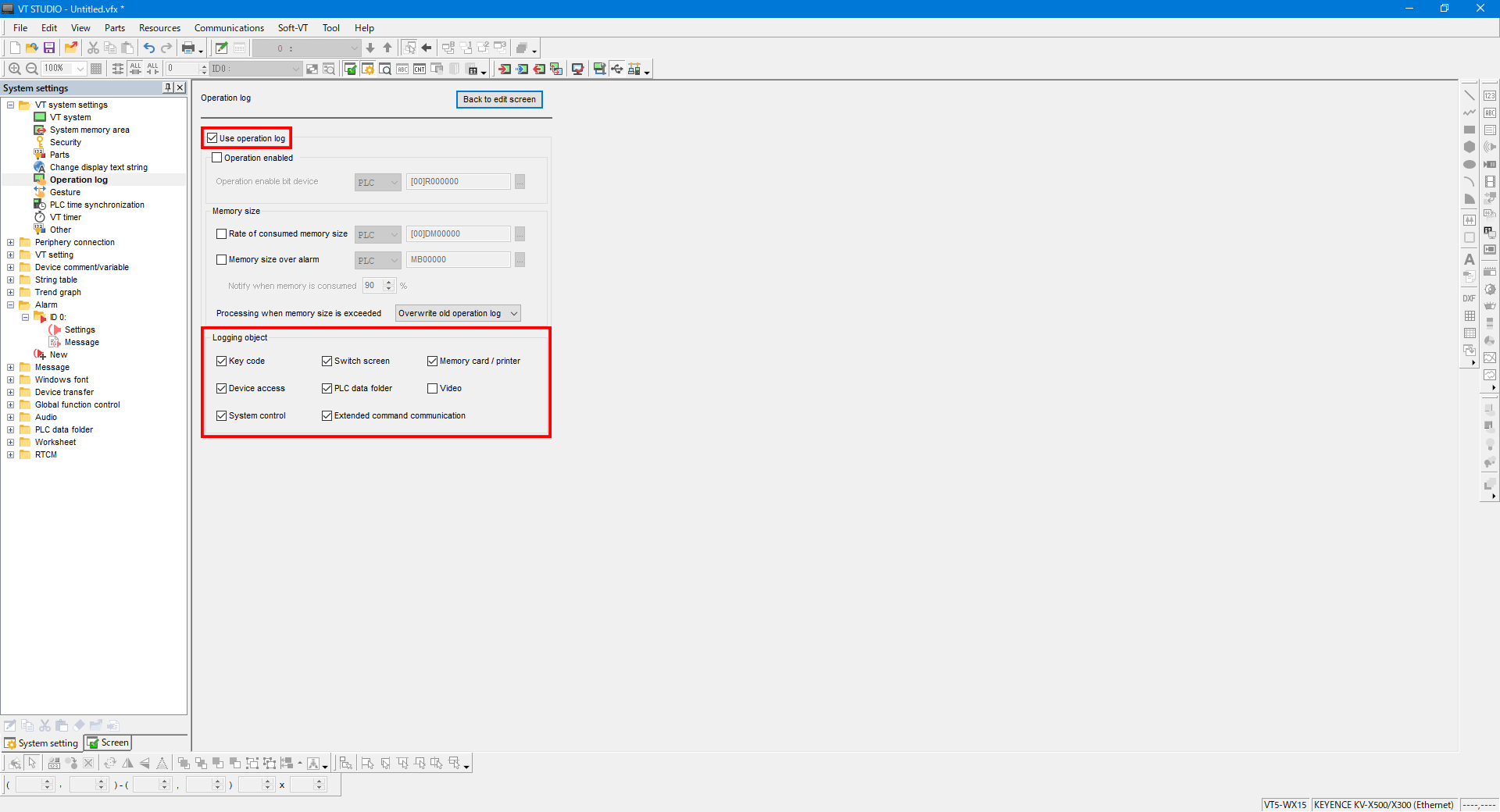 After configuring the settings, transfer the screen data to enable the VT5 operation log function.